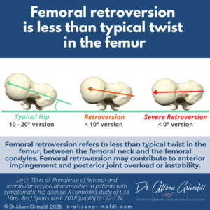 Femoral retroversion refers to less than typical twist in the femur, between the femoral neck and the femoral condyles. Femoral retroversion may contribute to anterior impingement and posterior joint overload or instability.