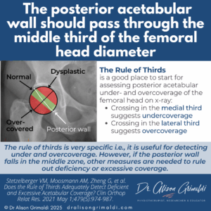 The posterior acetabular wall should pass through the middle third of the femoral head diameter