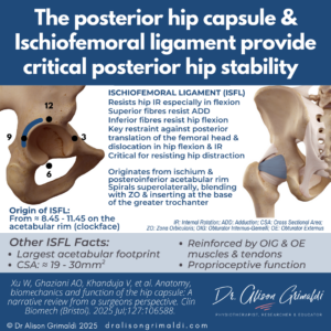 The posterior hip capsule & Ischiofemoral ligament provide critical posterior hip stability