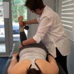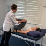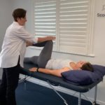 Assessing range of motion, end feel and patient comfort into hip flexion in supine