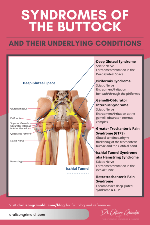 Getting to the bottom of buttock pain often presents a diagnostic dilemma, which is perhaps why the buttock appears to have been assigned more syndromes than any other region of the body. So, what exactly is a syndrome? While a disease is usually defined as a specific process that occurs within the body, the term ‘syndrome’ is used to describe a collection of symptoms. For musculoskeletal conditions, ‘syndrome’ may be appended to the body region or area of anatomy, simply denoting a collection of symptoms experienced in the area. Syndromes of the buttock include piriformis syndrome, gemelli-obturator internus syndrome, retro-trochanteric pain syndrome, deep gluteal syndrome, ischial tunnel syndrome, hamstring syndrome, and greater trochanteric pain syndrome. Let's take a walk through some of these syndromes and then discuss the relative merits or otherwise of such diagnoses.